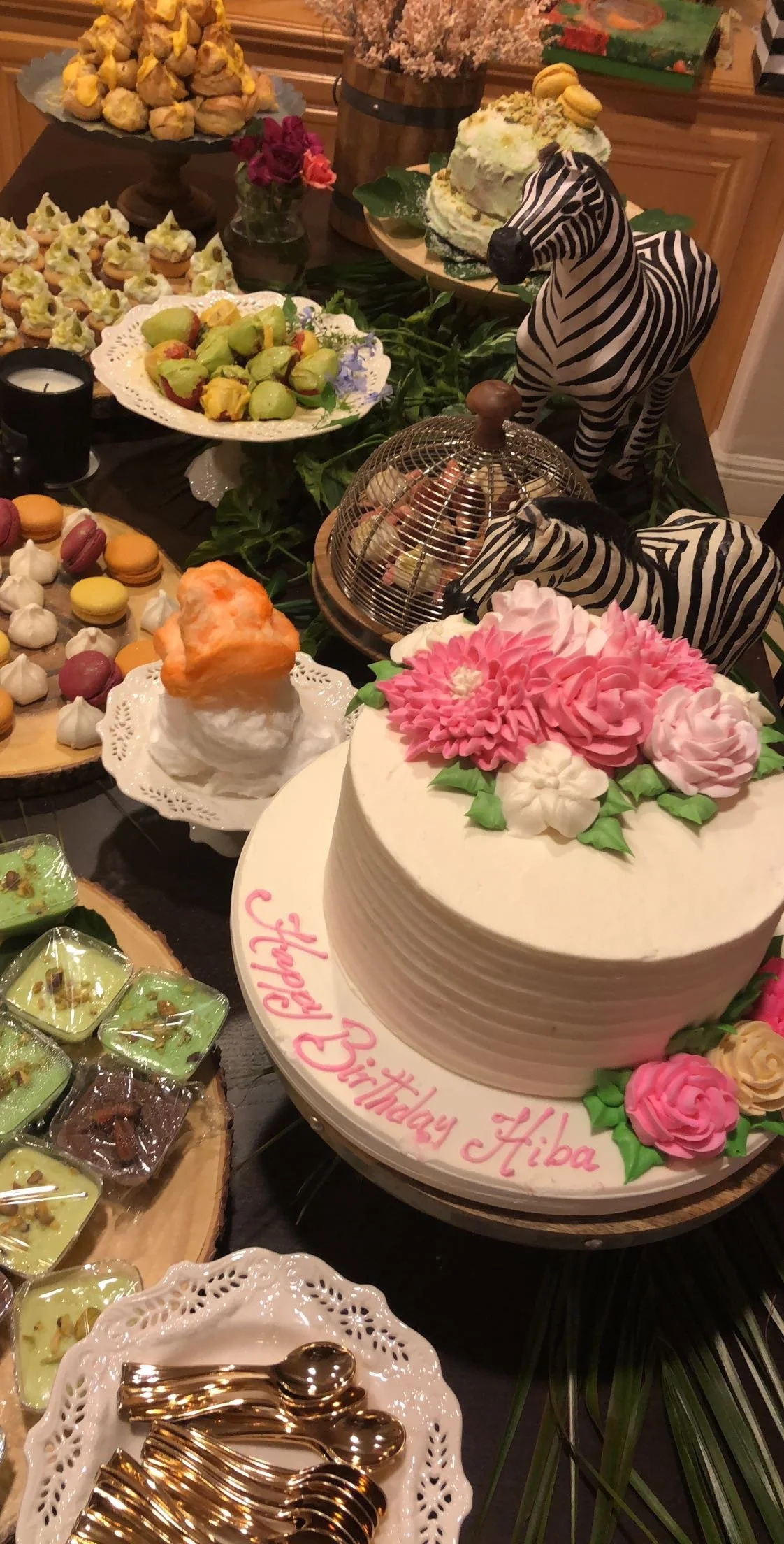 JUNGLE BIRTHDAY THEME TO CELEBRATE THE LOVE OF NATURE. GREENS AND YELLOWS WERE USED TO SET THE JUNGLE MOOD WITH SOME ACCENTS OF BRASS ELEMENTS. TROPICAL LEAVES, FERNS AND VINES WERE HUNG AND SPREAD AROUND THE HOUSE TO CREATE A LUSH, JUNGLE ATMOSPHERE. WOODEN TABLES WERE USED AND COVERED WITH VINES, AND WOODEN JUNGLE ANIMALS WERE DISPLAYED ALONG WITH A SMALL WATER FOUNTAIN TO CAPTURE THE JUNGLE FEEL AND SOUNDS.