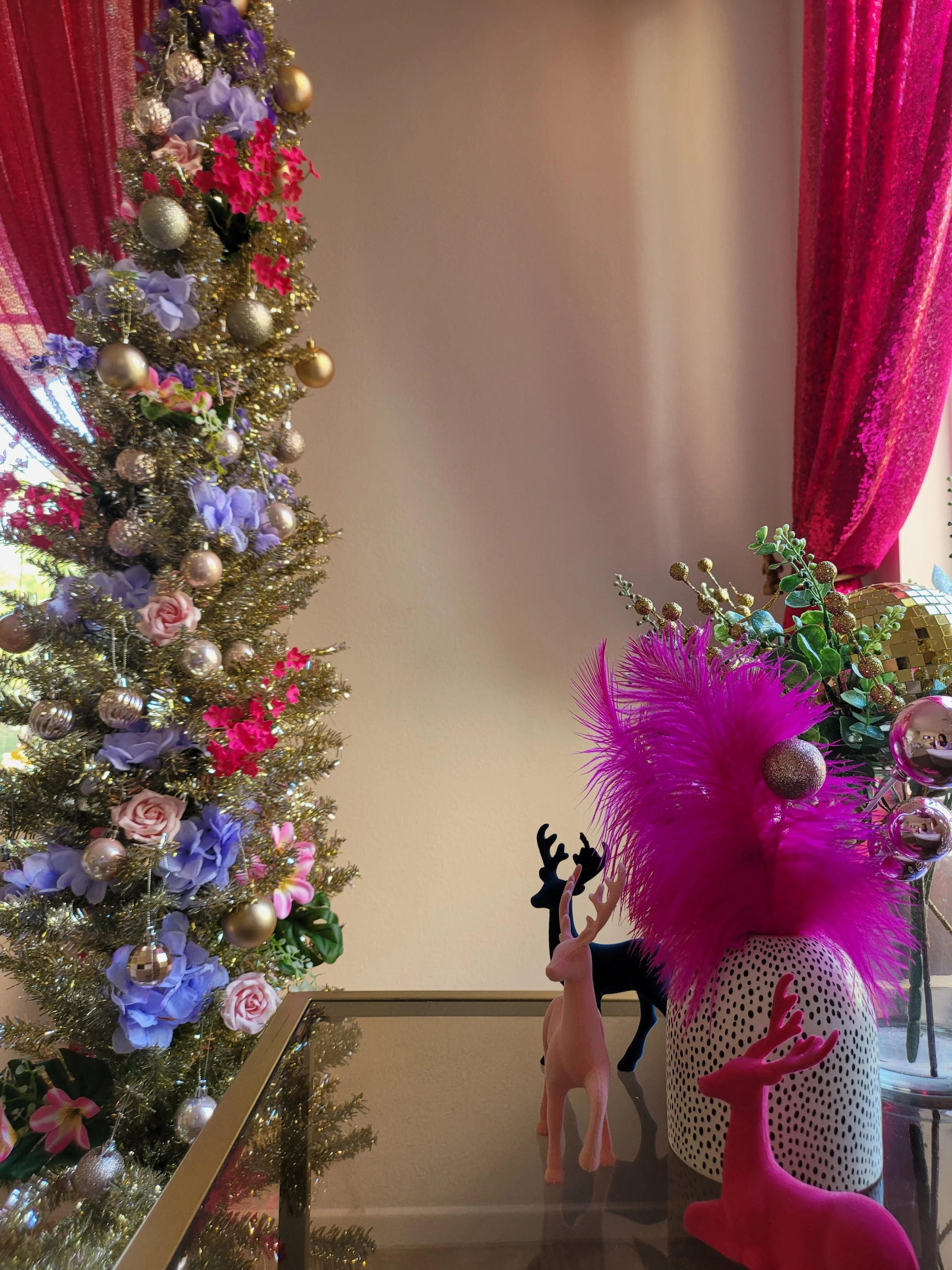 PINK CHRISTMAS GLAM PARTY WAS AN EYE-CATCHING THIS WINTER. WE THOUGHT OUTSIDE THE BOX AND DECIDED TO GO FOR A PINK THEME THIS WINTER. PINK STRING LIGHTS HELPED TO CREATE A WARM AND FESTIVE ATMOSPHERE. IN ADDITION TO THE USE OF FLORAL AND COLORFUL ORNAMENTS COMBINED WITH SILVER GLITTER BALLS TO CREATE A WHIMSICAL AND FUN THEME.